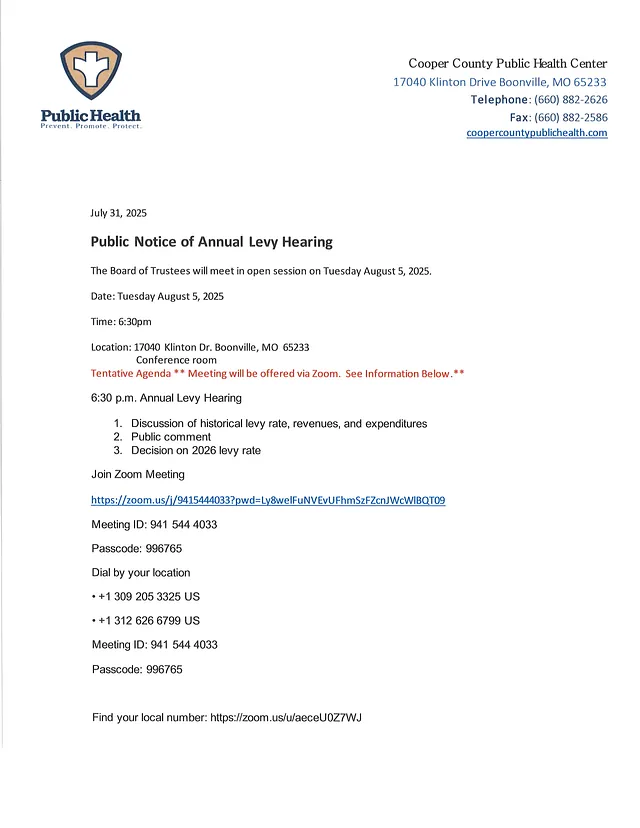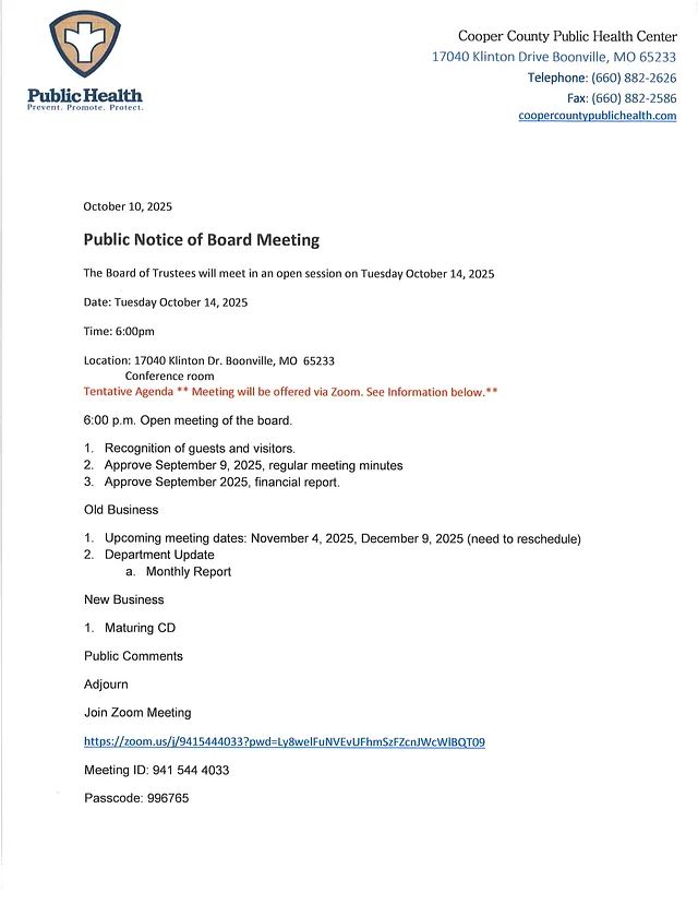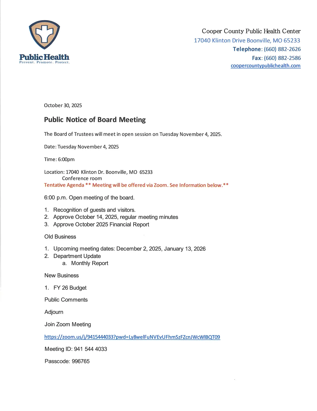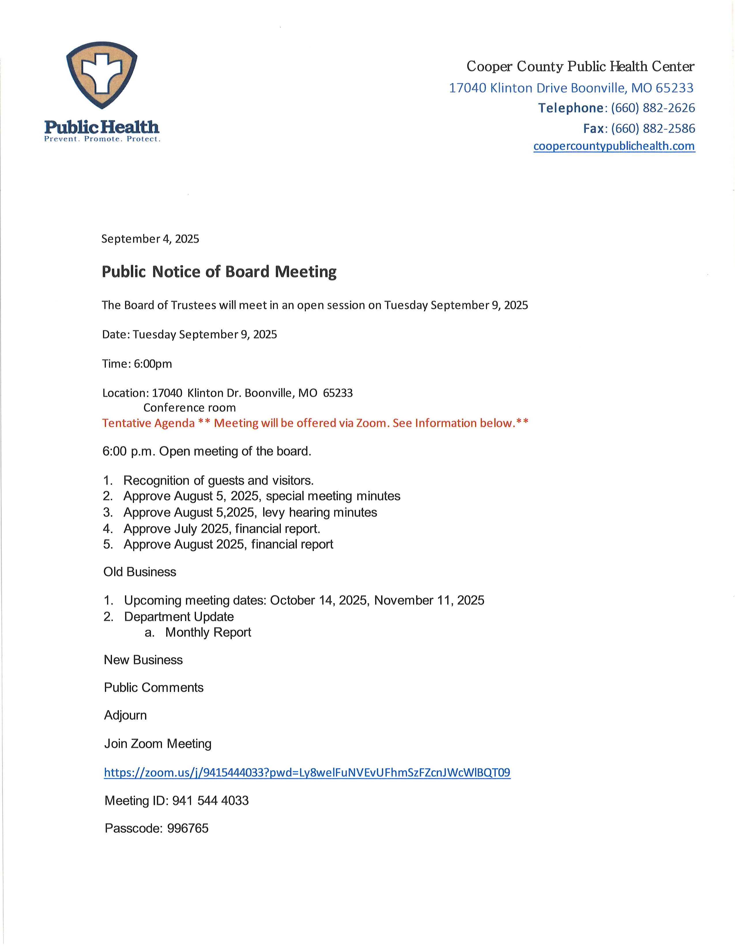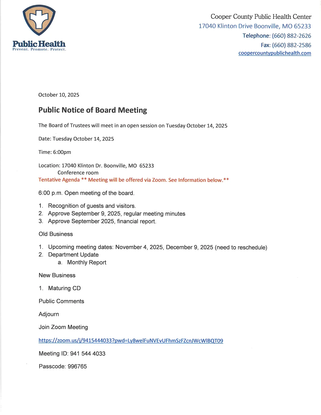 May Board Meeting Notice- Cancelled due to lack of Quorum