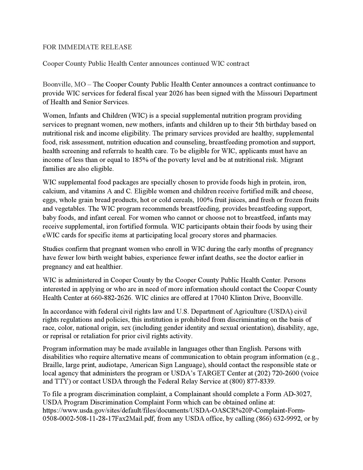 CONTINUED WIC CONTRACT FOR FISCAL YEAR 2026